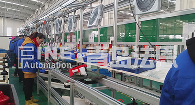 該線體總長(zhǎng)28m,采用倍速鏈輸送模式 ,更好的控制生產(chǎn)節(jié)拍,每個(gè)工位設(shè)有擱物板、工具櫥和呼料警報(bào)燈,使作業(yè)更方便。
